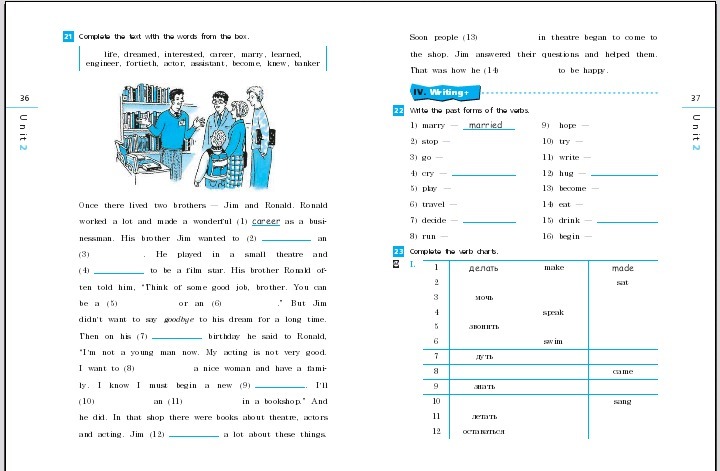 Once there lived two brothets - Jim and Ronald. Ronald worked a lot and madr a wonderful (1) career as a businessman. His brother Jim wanted to (2) ... an (3) ... .He played in a small theatre and (4) ... to be a film star. His brother Ronald often told him, "Think of some good job , brother. You can be a(5) ... or an (6) ... ." But Jim didn't to say goodbye to his dream for a long time. Then on his (7) ... biryday he said to Ronald , "I'm not a young man now. My acting is not very good. I want to (8) ... a nice woman and have a family. I know I must begin a new (9) ... .I'll (10) ... an (11) ... in a bookshop." And he did . In that shop there were books about theatre, actors and acting .Jim (12) ... a lot about these things.Soon people (13) ... in theatre began to come to the shop . Jim answered their questions and helped them. That was how he (14) ... to be happy.