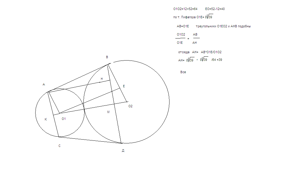 2. Окружности радиусом 12 и 52, касаются внешним образом. Точки a и b лежат на первой окружности. Точки c и d на второй. При этом ac и bd - общие касательные окружности. Найти расстояние между прямыми ab и cd.