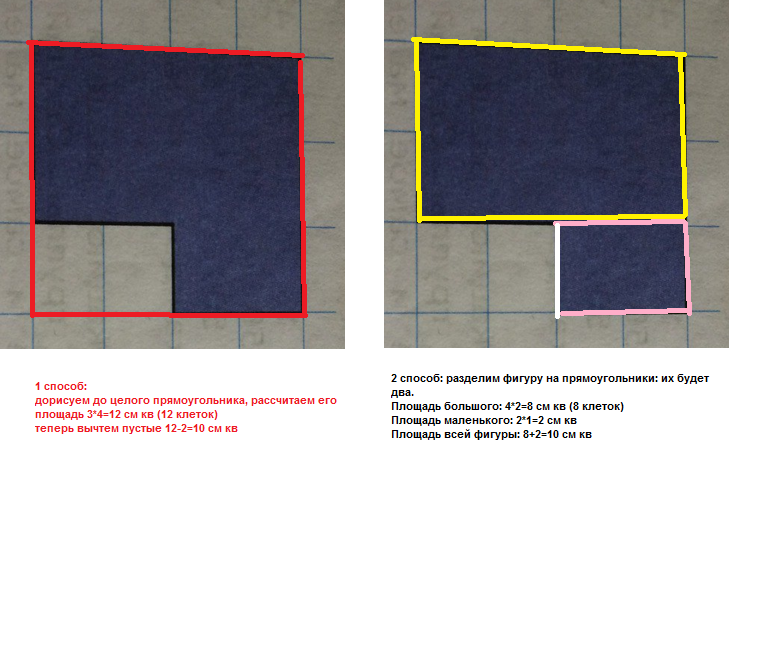 Площадь каждой клетки равна 1 см в квадрате. Вычисли площади фигур разными способами.