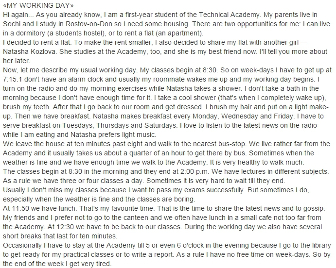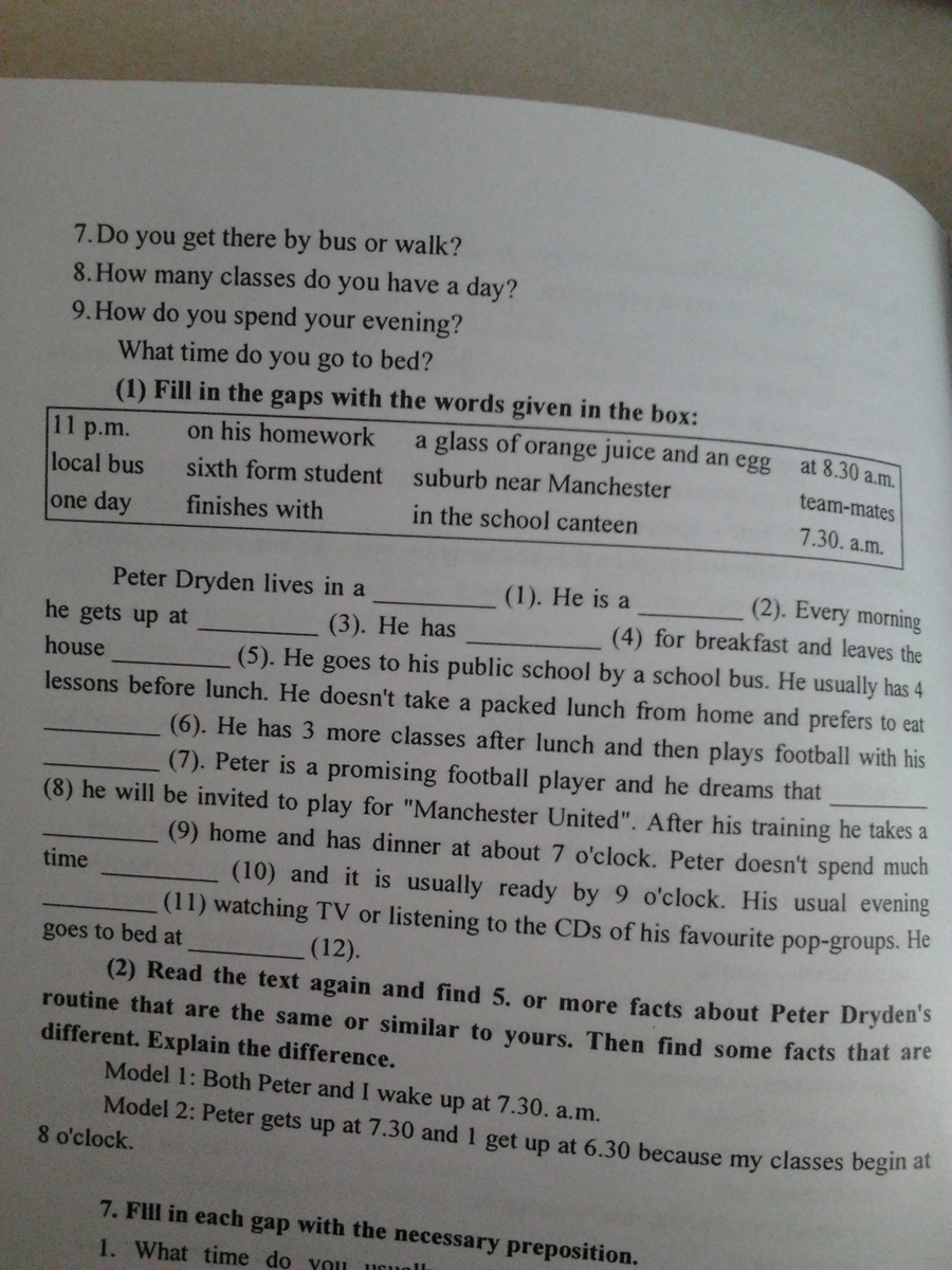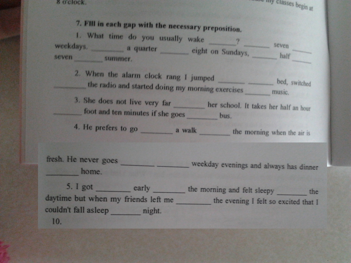 1. What time do you usually wake up? At seven on weekdays. At a quarter past eight on Sundays. At half past seven in summer.