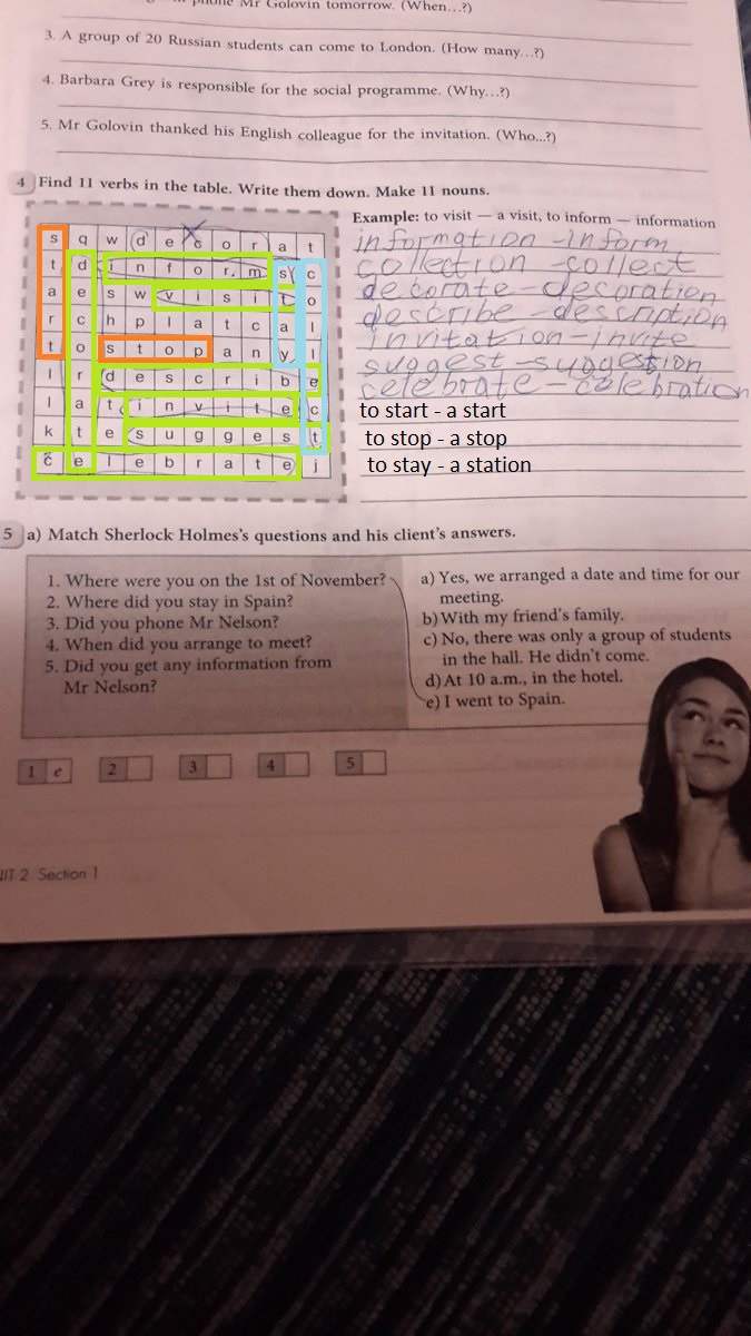Найдите пожалуйста 4 слова из этой таблицы я нашел только 7 и добавьте ко всем найденным словам частицу -tion