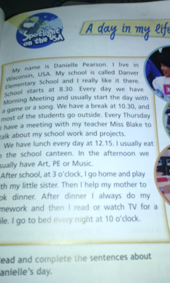 Меня зовут Дэниэл Пирсон. Я живу в Висконсине, США. Моя школа называется Дэнверская начальная школа, и мне очень нравится здесь учиться. Занятия начинаются в 8:30. Каждое утро у нас проходит Утренняя Встреча, и обычно мы начинаем день с игры или песни. В 10:30 у нас перерыв, и большинство учеников идёт на улицу. Каждый четверг я встречаюсь со своей учительницей мисс Блейк, чтобы поговорить о моей работе в школе и проектах.