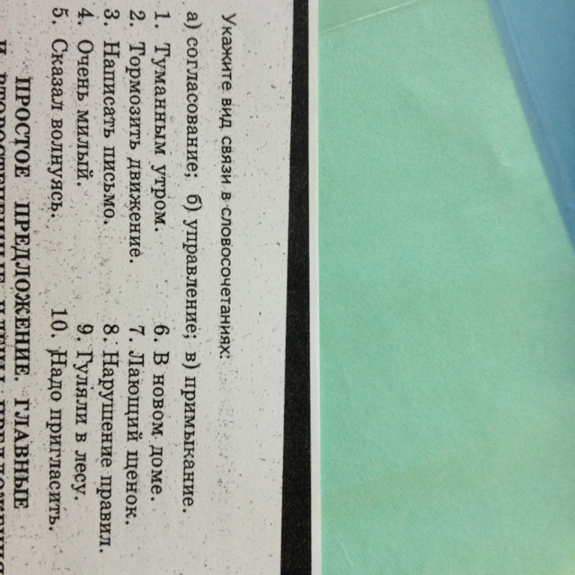 туманным утром - согласование; тормозить движение - управление; написать письмо - управление; очень милый - примыкание; сказал волнуясь - примыкание; в новом доме - согласование; лающий щенок - согласование; нарушение правил - управление; гуляли в лесу - управление; надо пригласить - примыкание.