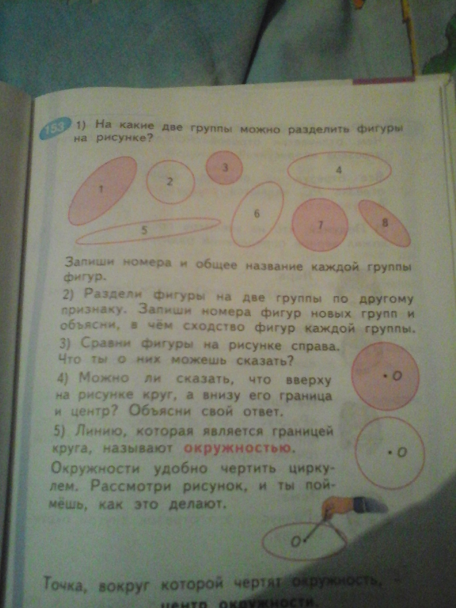 1)На какие две группы можно разделить фигуры.Запиши номера и общее название каждой группы фигур.2)Раздели фигуры на две группы по другому признаку.Запиши номера новых групп и обьясни в чём сходство фигур каждой группы.3)Сравни фигуры на рисунке справа.Что ты о них можешь сказать.4)Можно ли сказать что вверху на рисунке круг а внизу его граница и ценр.Обьясни свой ответПомогите решить пожалуйста срочно надо.По рисунку