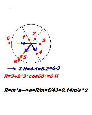 К центру однородного шара масса которой 43 кг приложено шесть сил, которые лежат в одной плоскости и образуют между сосиднимы силами угол 60 градусов. Модули сил соответственно равны 1Н 2Н 3Н 4Н 5Н 6Н. определите в каком направлении и с каким ускорением будет двигаться шар?