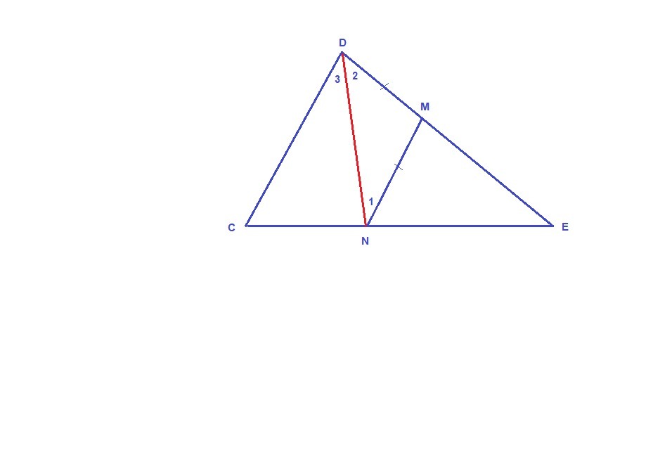 ∠1 = ∠2 как углы при основании равнобедренного треугольника DMN,