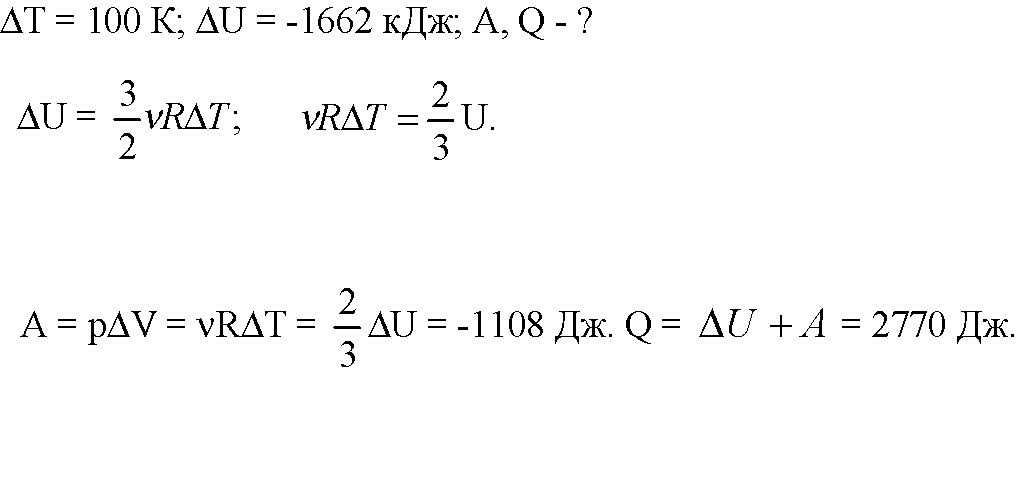 A=P * дельтаV=nR* дельта T=2/3 дельта U=-1108 минус означает, что направление силы и перемещения не совпадают, это нормально)