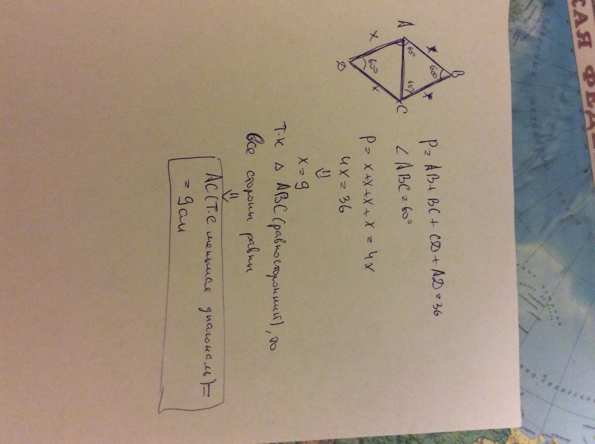 Периметр ромба равен 36 см, а острый угол равен 60 градусам.Найдите меньшую диагональ ромба