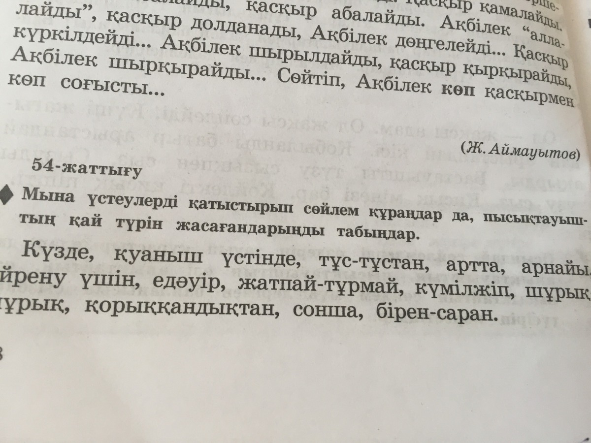 Мына создерге сойлем курап бериниздерши, адеби тилде: кузде, куаныш устинде, тус-тустан, артта, арнайы, уйрену ушин, едауыр, жатпай-турмай, кумилжип, шурык-шурык, корыккандыктан, сонша, бирен-саран