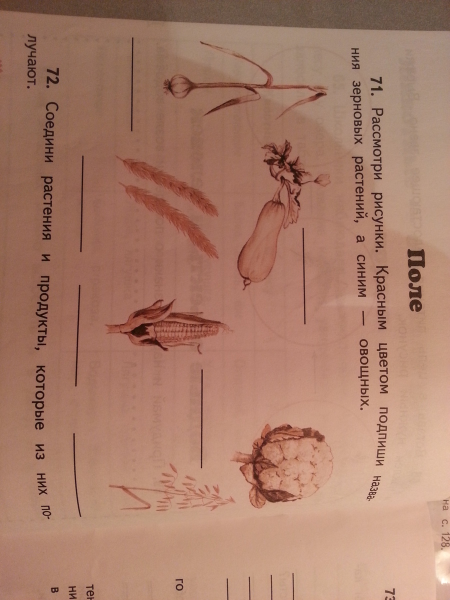 Расмотри рисунки.Красным цветом подпеши названия зерновых растений,а синим-овощных