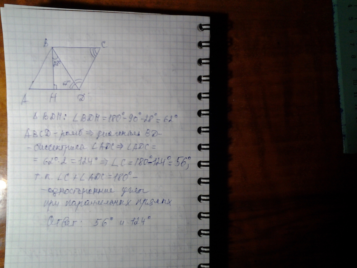Найдите углы ромба, если угол между высотой и диагональю ромба проведёнными из одной вершины, равен 28 градусов