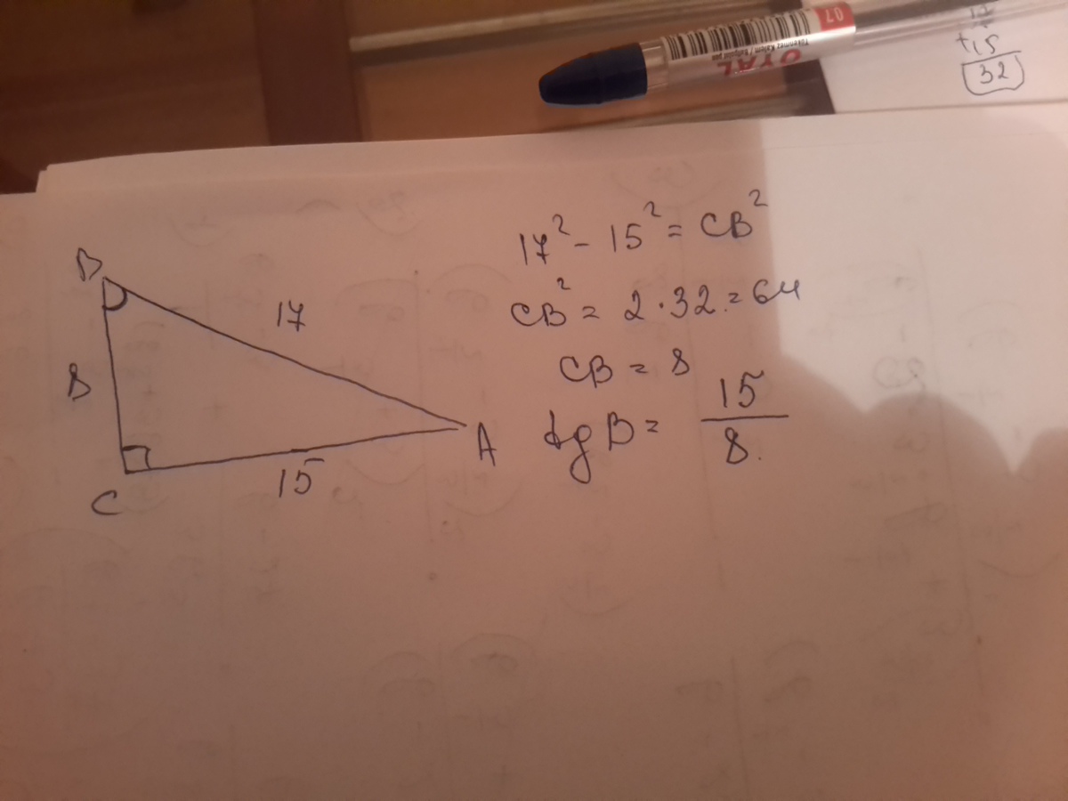 в прямоугольном треугольнике ABC гипотенуза AB равна 17 AC равен 15 найдите тангес угла B