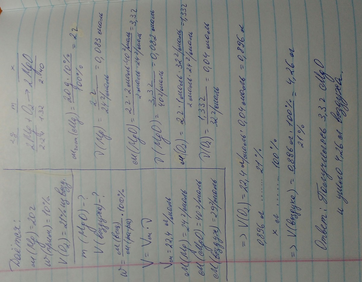 магниевую стружку массы 20 грамма подожгли и подождали конца реакции сколько граммов оксида магния получилось и какой объем воздуха (н.у) потребовался для реакции, если стружка содержала 10% примесей? известно что в воздухе содержится 21% кислорода по объему. СРОЧНО