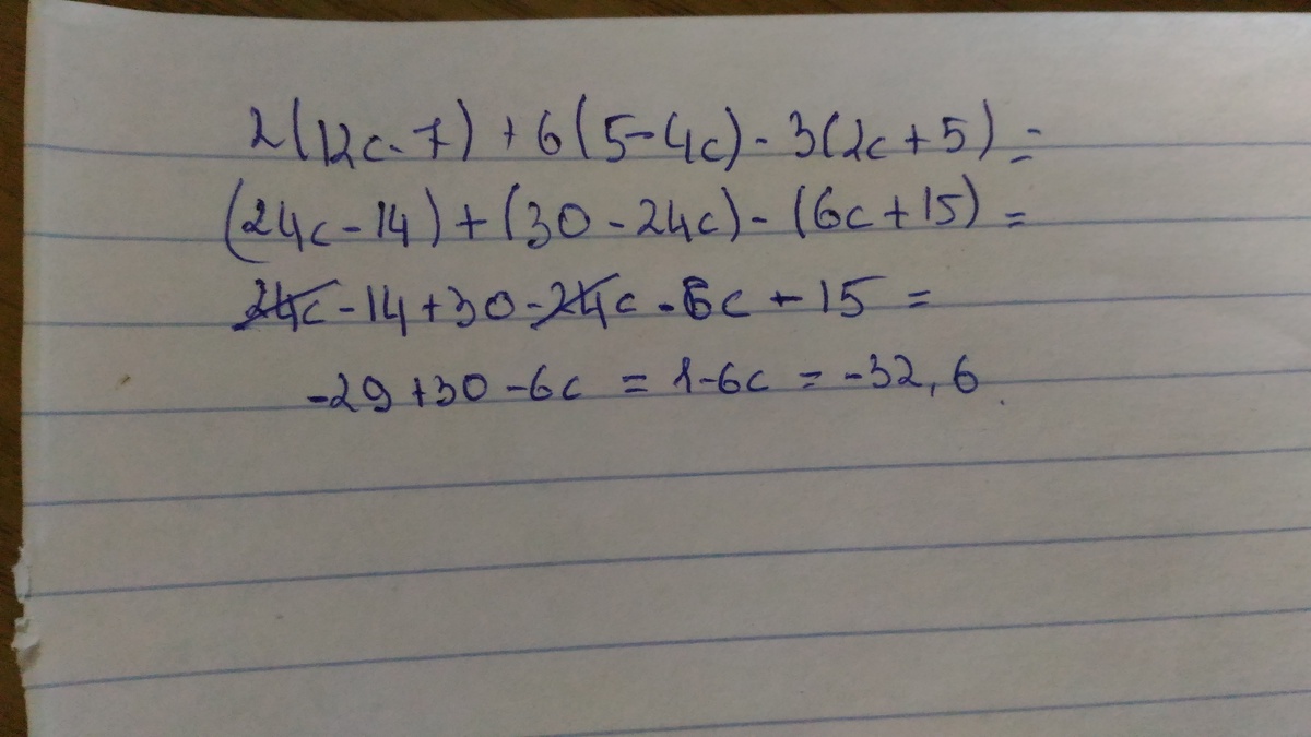Найдите зачение выражения 2(12с-7)+6(5-4с)-3(2с+5) ПРИ С=5,6