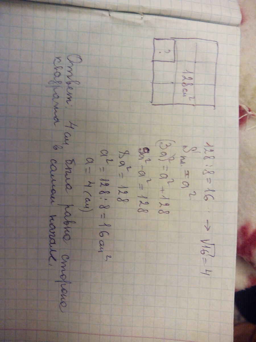 Дан квадрат. Его сторону увеличили в 3 раза, и площадь квадрата увеличилась на 128 см2. Чему была равна сторона квадрата в самом начале?