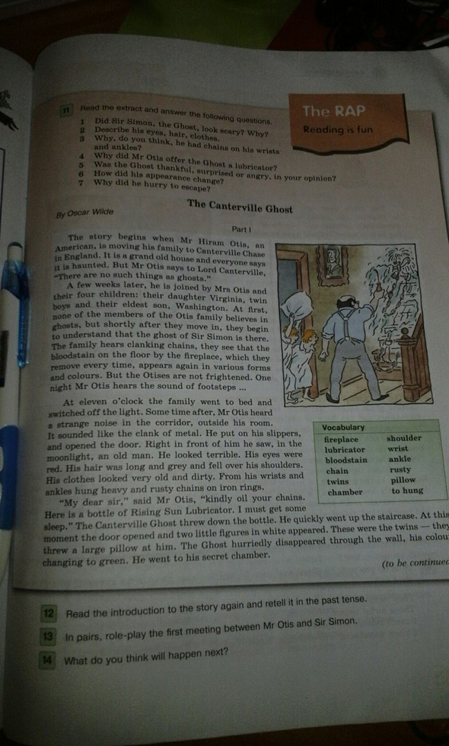 Уважаемый сэр, сказал мистер Отис, будьте любезны смазать маслом ваши цепи, вот здесь бутылка смазки "Встающее Солнце". Я должен немного поспать. Кентервильское привидение опрокинуло бутылочку. Он быстро пошел по леснице, в этот момент дверь открылась и появилось два маленьких силуэта в белом. Это были двойняшки, они кинули в него большой подушкой. Привидение поспешно исчезло через стену, его цвет изменился на зеленй. Он прошел в свою секретную комнатушку.