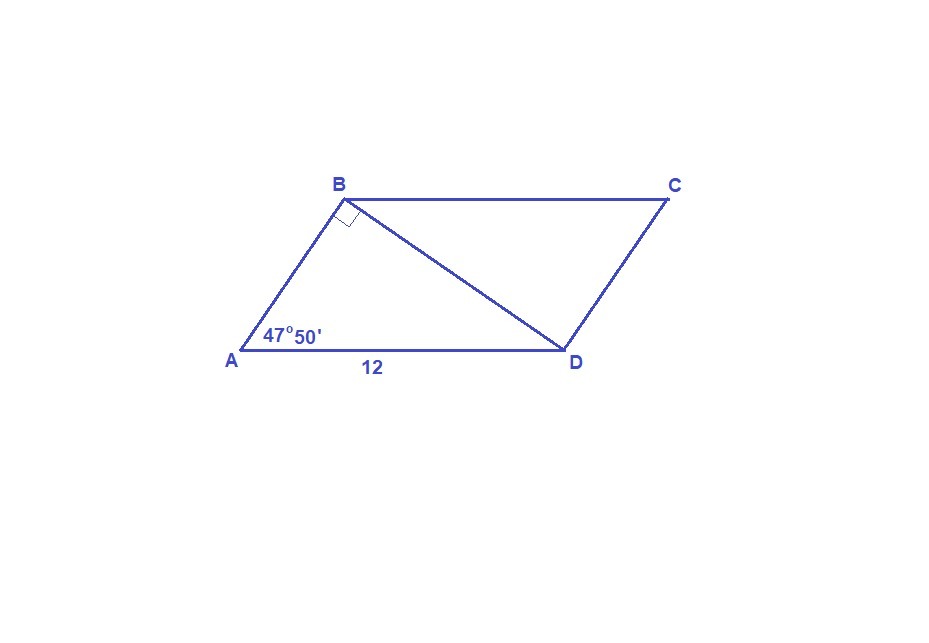 В параллелограмме ABCD сторона AD равна 12 см, а угол BAD равен 47°50'. Найдите площадь параллелограмма, если его диагональ BD перпендикулярна к стороне АВ.