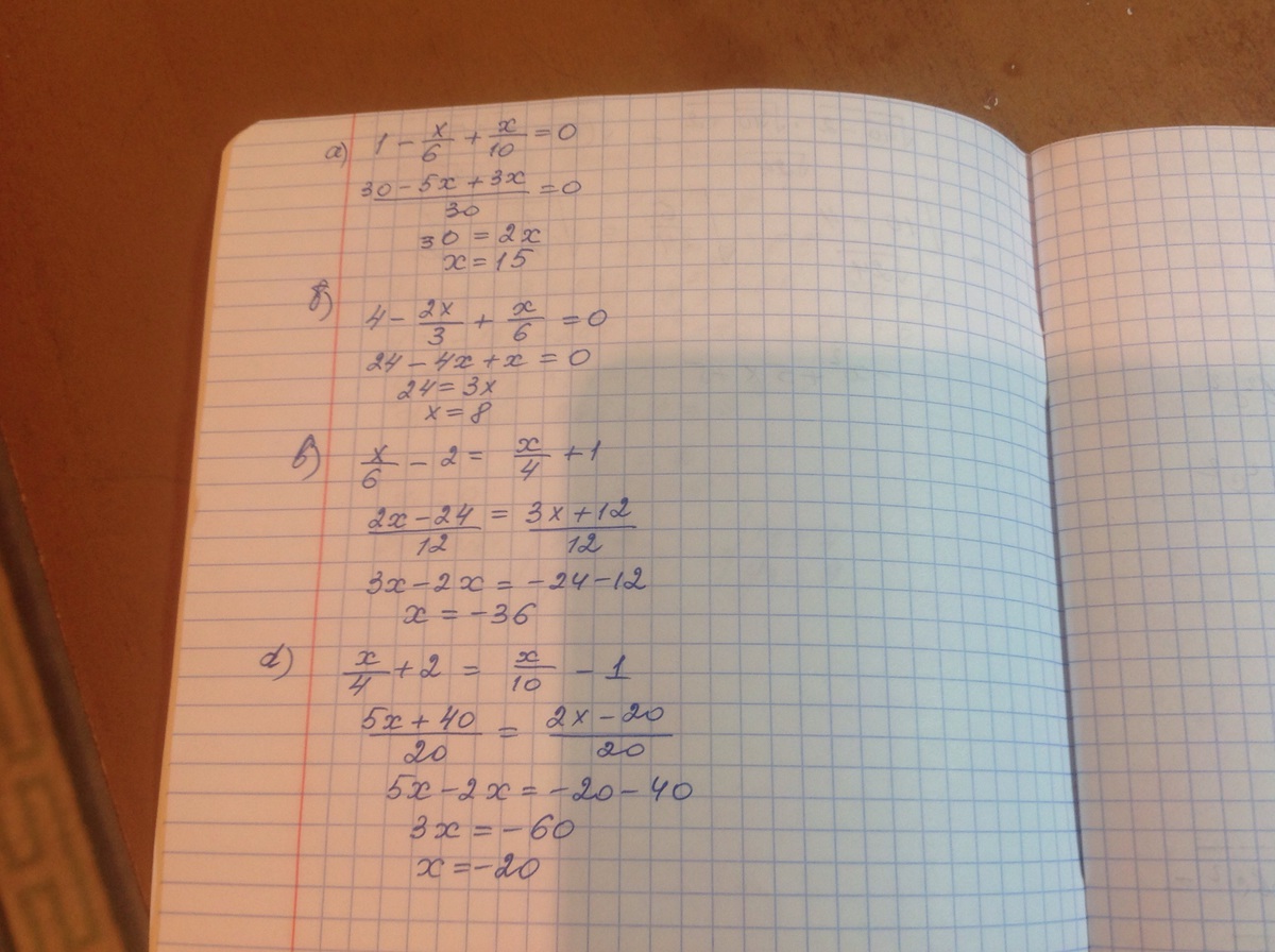 b)4-2x/3+x/6=0(x/6 и 2x/3 обыкновенные дроби так во всех уравнениях.)