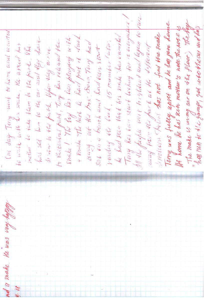 помогите написать небольшое сочинение по плану Plan Title: What a day! Paragraph 1 : snake is not in basket/get into car/ drive to the park paragraph2: at the park /take the snake out/play with the snake/put it back in basket Terry/read book/15 minutes later/snake is not in the basket Paragraph3: Terry/look everywhere/start shouting/ call the police/people scared/everyone leave the park/ police can t find the snake Paradraph4; Terry sad/ drive home /notice/snake/sleep on car floor/ both happy
