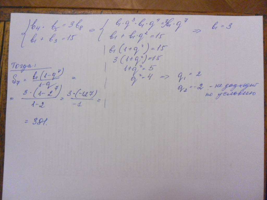 найдите сумму первых семи чисел геометрической прогрессии, зная ,что прогрессия возрастающая и b4*b5=3b8 и b1+b3=15