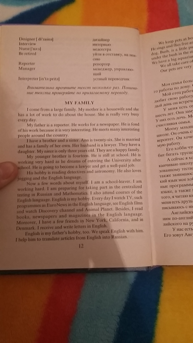 Hello.I have 5 people in my family.I have a father,a mother and two sisters.My mother is the doctor.My father is a teacher.And my two sisters are pupils.My sister studies in Moscow State University.She wants to be a doctor.I am studying in school.I want to be a doctor too.I love my family.