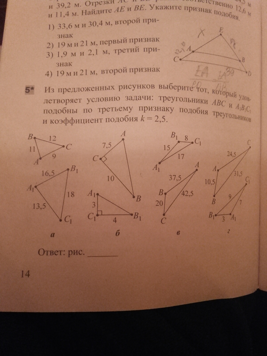 Это рисунок в, третий признак подобия: по 3 торонам. Коэффициент подобия означает, что все три стороны одного треугольника больше в 2,5 раз, по всем этим параметрам подходит только рисунок В. 42,5÷17=2,5