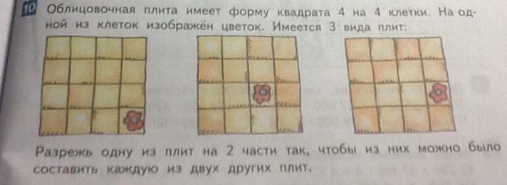 Облицовочная плита имеет форму квадрата 4 на 4 клетки. на одной из клеток изображён цветок. Имеется 3 вида плит: Разрежь одну из плит на 2 части так, чтобы из них можно было составить каждую из двух других плит.