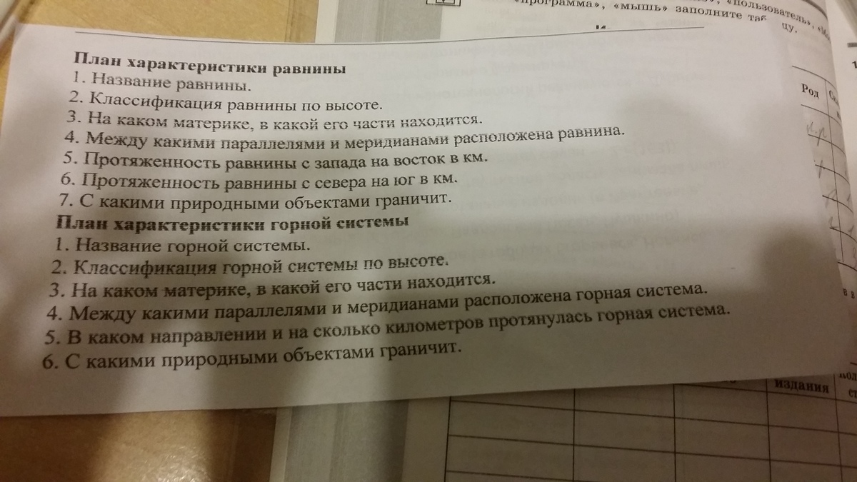 нужно взять какую - нибудь РАВНИНУ И ГОРНУЮ СИСТЕМУ и описать эти две вещи по этим вопросам.
