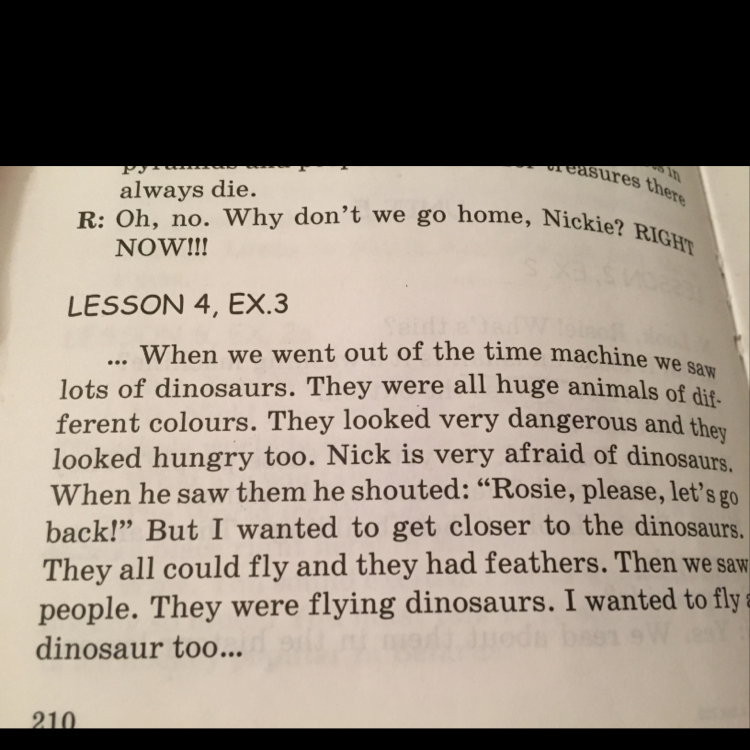 Когда мы вышли из машины времени,мы увидели множество динозавров.Они все были большими животными разных цветов(разного цвета).Они выглядели опасными, а также оч голодными.Ник оч испугался динозавров.Он закричал:Рози, пожалуйста, давай вернемся!Но я хотела подойти ближе к динозаврам.Они все могли летать и у всех были перья.Затем мы увидели людей.Они летали на динозаврах.Я тоже хотела летать на динозавре...