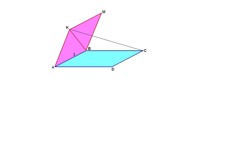 Плоскости квадрата ABCD и ромба ABMK взаимно перпендикулярны.Найдите длину СК,если сторона ромба равна 3 см,а его острый угол равен 60 градусов