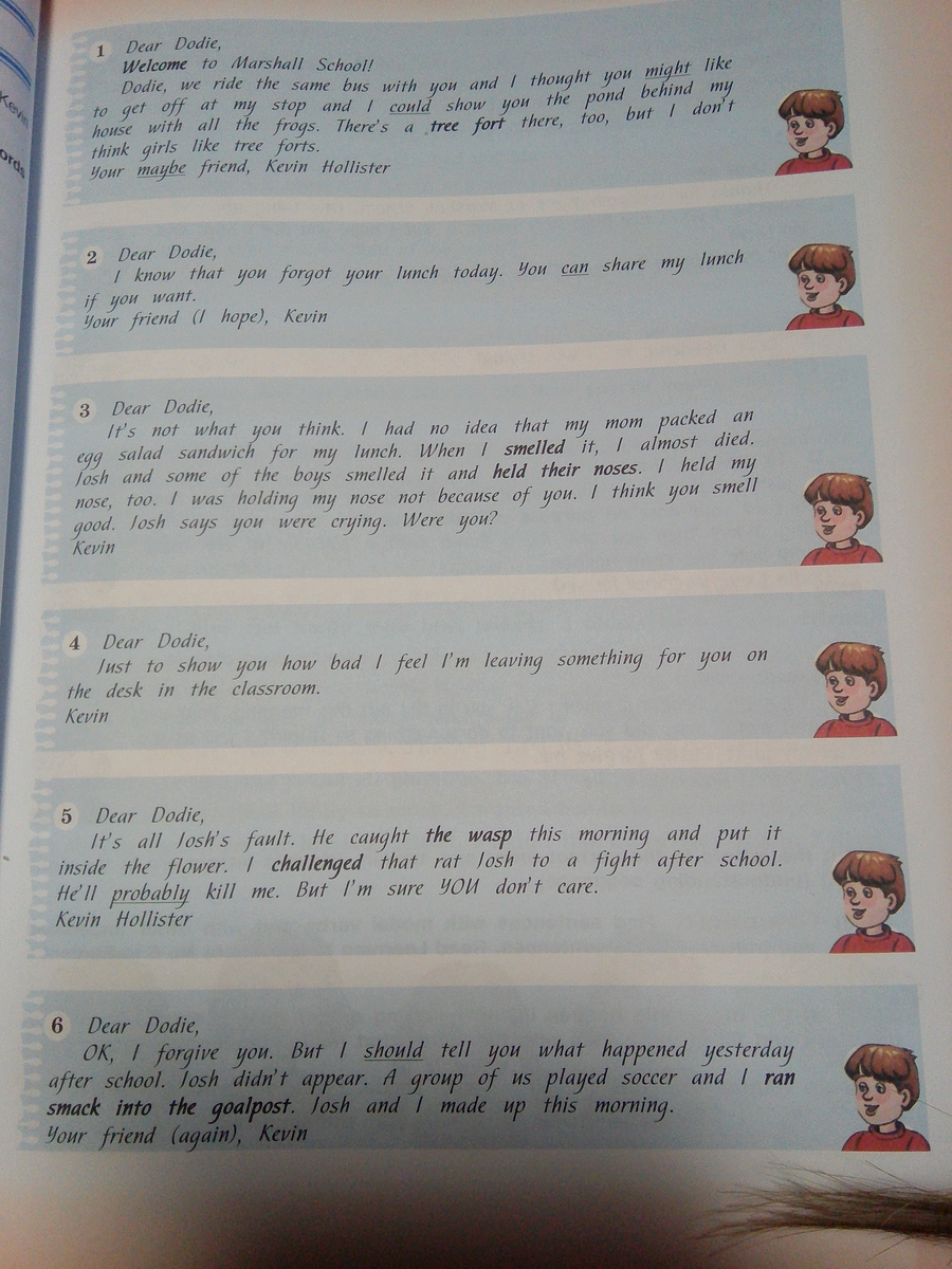 Дорогая доди, это не то, что ты думаешь. Я не знал, что моя мама завернула мне яичный салат на обед. Когда ч чувствую этот запах, я почти умираю. Джош и некоторые ребята тоже чувствуют и зажимают носы. Я зажимаю нос тоже. я зажимал нос не из за тебя.я думаю, что ты пахнешь хорошо.Джош говорит, что ты плакала.Где ты?Кевин