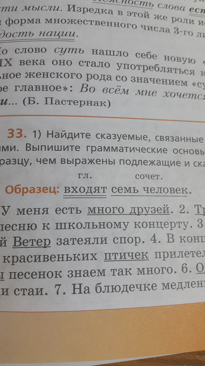 Найдите сказуемые,связанные с подчёркнутыми подлежащими.Выпишите грамматические основы предложений.Укажите по образцу,чем выражены подлежащие и сказуемые.