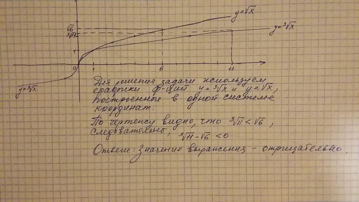 Как без калькулятора определить знак выражения: ^3V(11) - V(6) (то бишь разность кубического корня из 11 и квадратного корня из 6) ?