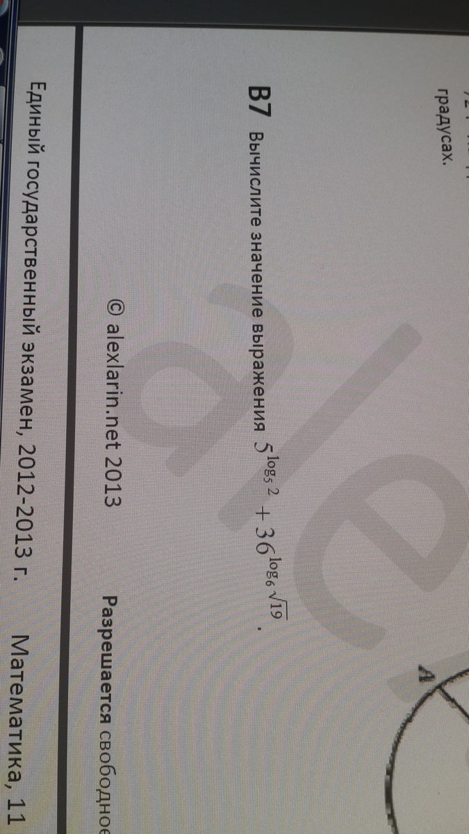 5^(loq(5)2)+36^(loq(6)V19)=2+6^(2*loq(6)V19))=2+6^(loq(6)(V19)^2)-2+19=21