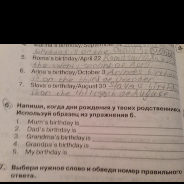 Напиши когда дни рождения у твоих родственников использую образец из упражнение шесть