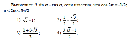 Люди помогите очень срочно нужно, выручайте пожалуйста "Вычислите 3sin a - cos a если известно что cos 2a = -1/2 ; п < 2a < 3п/2 (см. внутри варианты решения) Заранее спасибо. Оставлю отзывы и благодарность на странице решившего