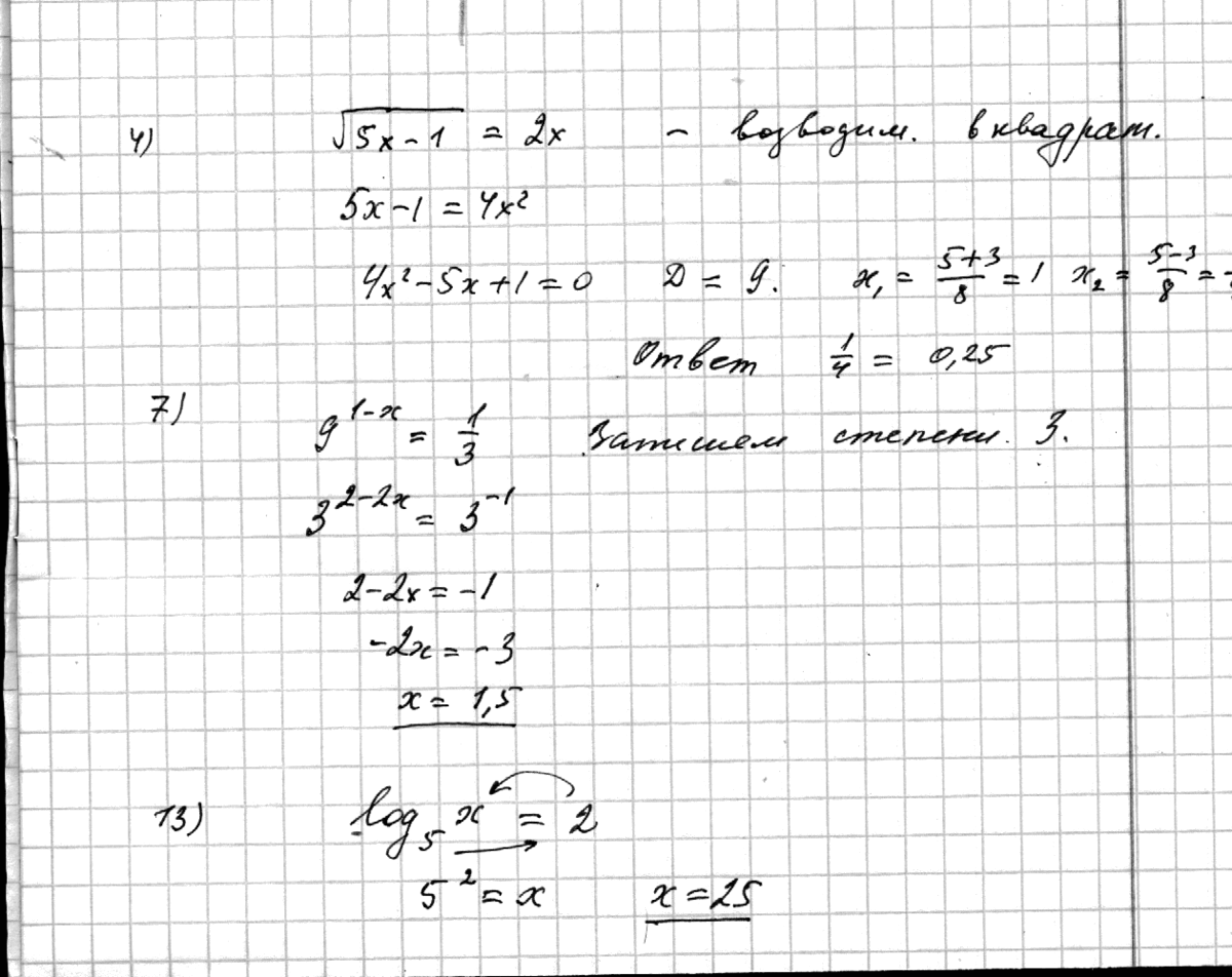 Здесь несколько типов уравнений. Иррациональные решаются возведением в квадрат обеих частей,в показательных обе части приводятся к степеням одного числа, а логарифмические по определению,на примере стоят стрелки.