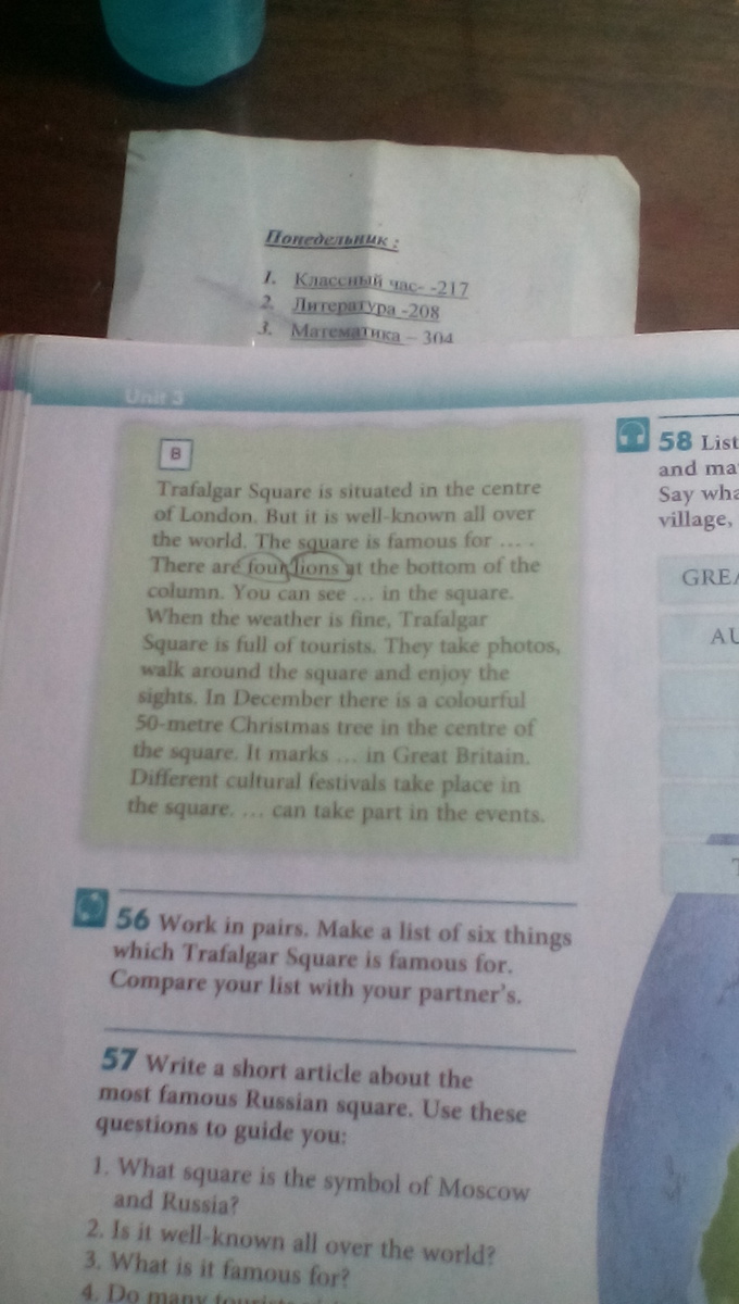 Трафальгарская площадь находится в центре Лондона. но известна она по всему миру. площадь известна благодаря ... . 4 льва находятся в самомо низу колонны. там можно увидеть ... . если погода хорошая, на площади много туристов. они фотографируются, гуляют, рассматривают достопримечательности. в декабре в центре площади стоит 50-метровая елка. различный концерты проходят на площади ... ты можешь принять участие в них