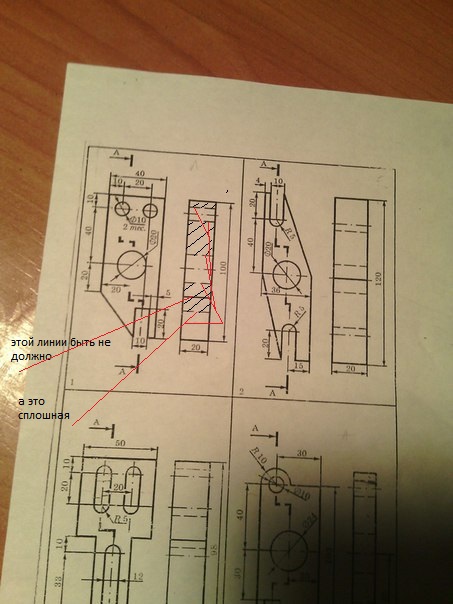 пояснения на чертеже, линии отверстий должны быть сплошными, а ребро видно не будет, так как это уже разрез, короче её быть там не должно,