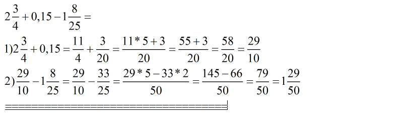 Помогите пожалуйста ,срочно!!! Две целых 3/4 +0,15-одна целая 8/25 . ответ в обыкновенной дроби