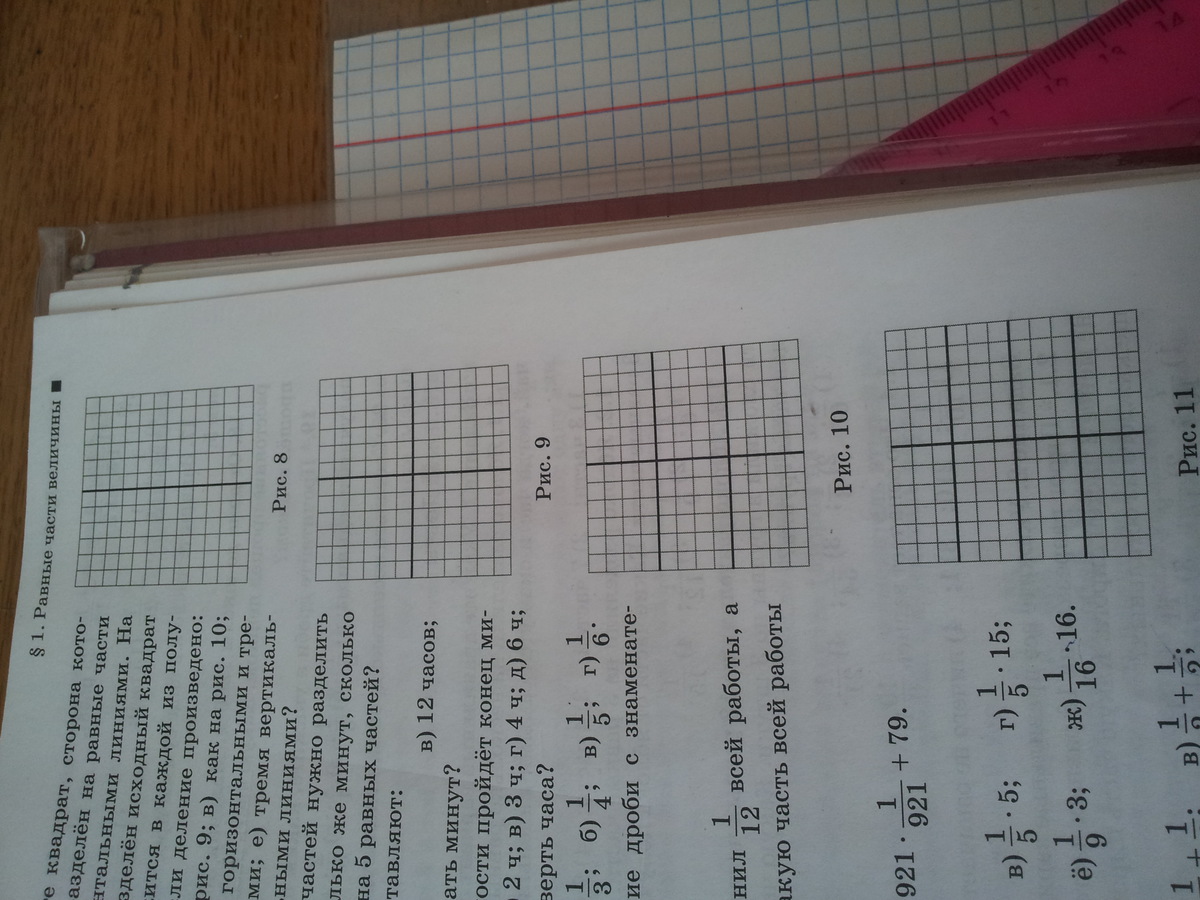 на клетчатой бумаге квадрат, сторона которого равна 12 клеткам, разделён на равные части вертикальными и горизонтальными линиями. на сколько равных частей разделен исходный квадрат и сколько клеток содержится в каждой из полученных равных частей, если деление произведено: а) как на рисунке 8; б) как на рисунке 9; в) как на рисунке 10; г) как на рисунке 11; д) двумя горизонтальными и тремя вертикальными линиями; е) тремя вертикальными и пятью горизонтальными линиями?