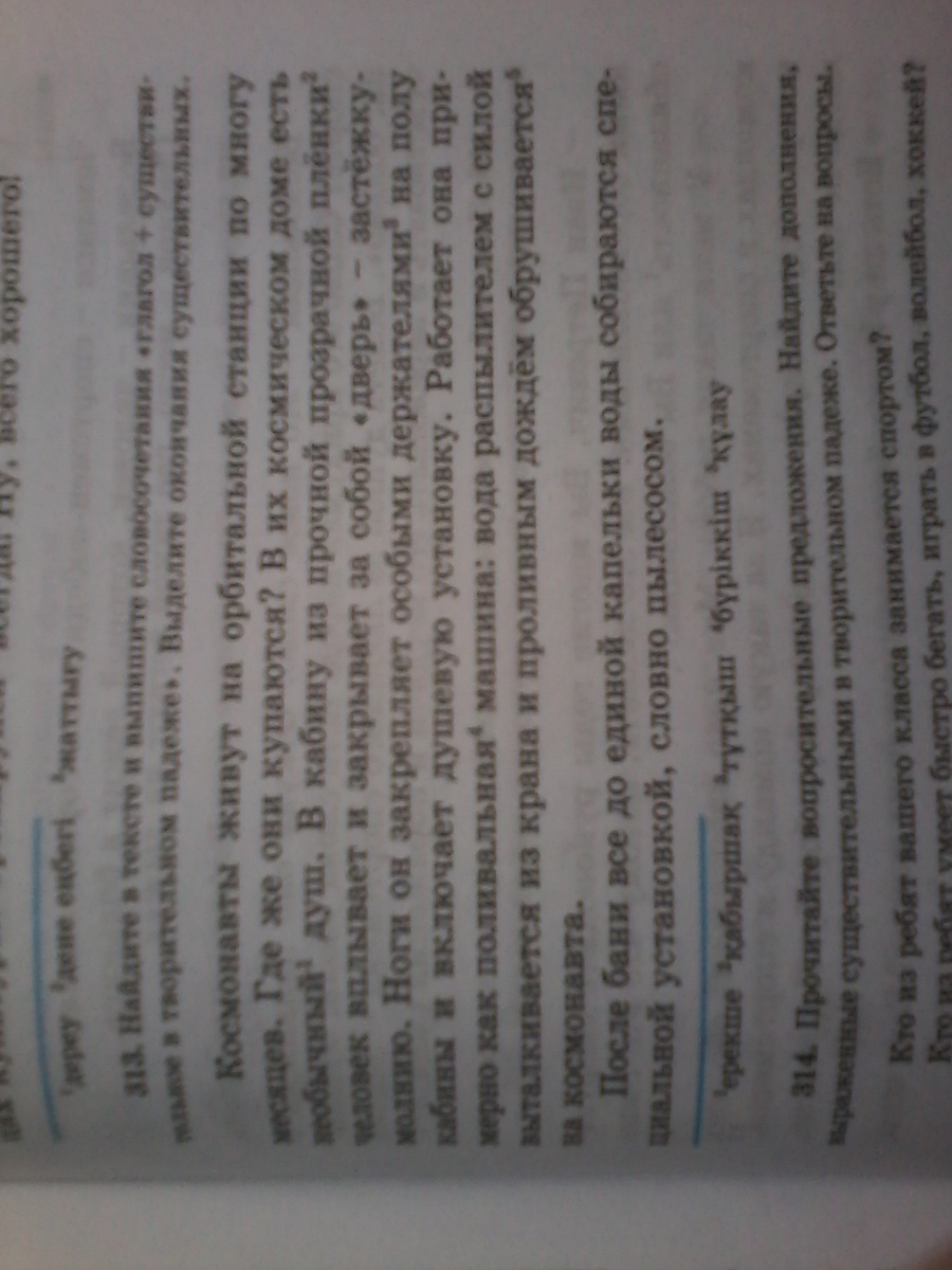 Упр.313 Найдите в тексте и выпишите словосочетания "Глагол+Существительное в творительном падеже". Выделите окончания существительных.