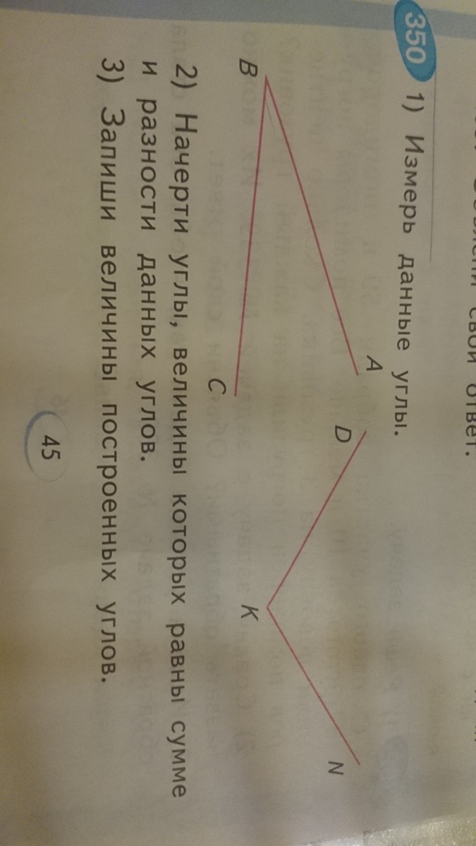 Измерь углы транспортиром,а затем из 1(сколько то градусов) вычти(в следующем действии нужно сложить!!!) 2(сколько то градусов).