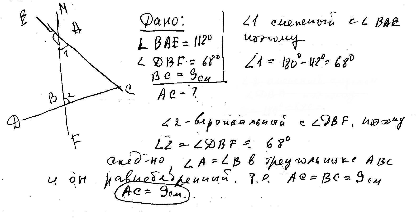 угол BAE=112 градусов, угол DBF=68 градусов, угол BC=9 см Найти: AC треугольника ABC