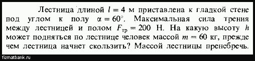 сила трения об пол равна силе реакцие опоры об стену;Fтр=N1;сила реакции опоры об пол равна mg;N2=mg;mgxcosa=Fтр(об пол)(x-длина при которой будет сохраняться равновесие)x=квадратный корень 3/3;вскоре чтоб узнать выстоу нужно x*sina (проекция на ось y)H=0.5 метра