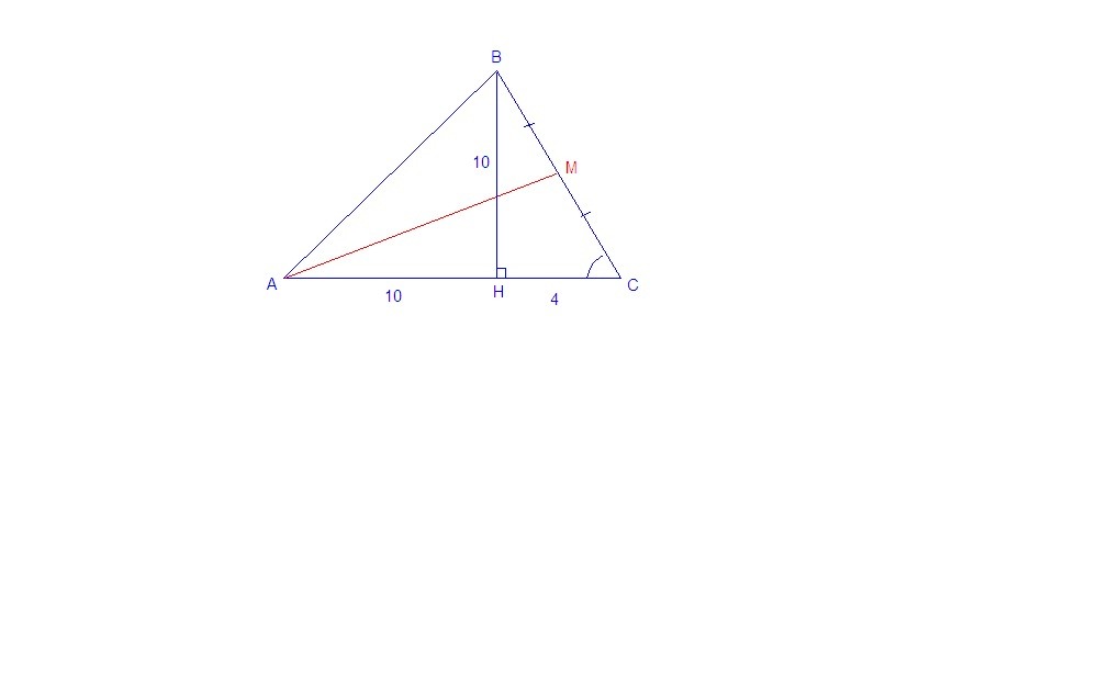 высота треугольника, равна 10 см , делит основание на два отрезка, равные 10 см и 4 см. Найдите медиану, проведенную к меньшей из двух сторон.