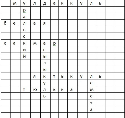 ПО ГОРИЗОНТАЛИ: 1. Самое соленок озеро. 2. Река, длиной 1430 км. 3. Правый приток реки Урал. 4. Самое глубокое озеро. 5. Какая рыба встречается реже всего в озерах. ПО ВЕРТИКАЛИ: 1. один из бассейнов, к которому относятся реки республики. 2. Самое большое озеро по объему воды. 3. Самая популярная река для сплавов.ОТВЕТЫ: ПО ГОРИЗОНТАЛИ: 1. мулдаккуль. 2. белая. 3. хакмар. 4. яктыкуль. 5. тюлька. ПО ВЕРТИКАЛИ: 1. уральский. 2. асылыкуль. 4. лемеза.
