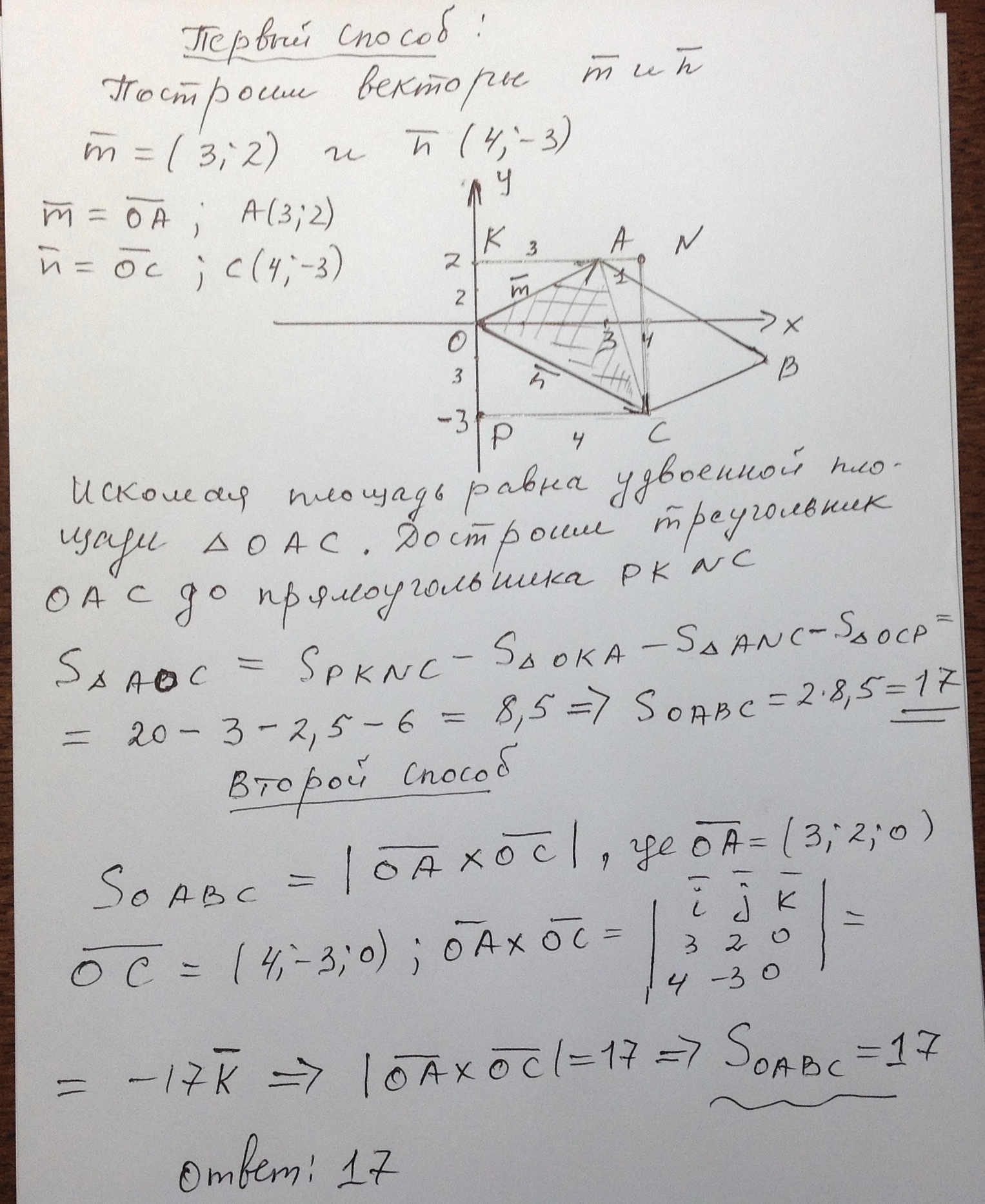 Найдите площадь параллелограмма ,построенного на векторах m=3i+2j и n=4i-3j