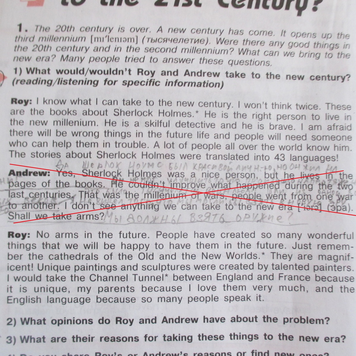 Рой: Я знаю, что я могу могу взять в новое тысячелетие. И не передумаю. Это книги о Шерлоке Холмсе. Это человек нового тысячелетия. Он храбрый и опытный детектив. Я думаю, что в будущем будут происходить не справедливые вещи и людям нужен то, кто поможет им в беде. Множество людей по всему миру знают о нет. Истории о Шерлоке были переведены на 43 языка!