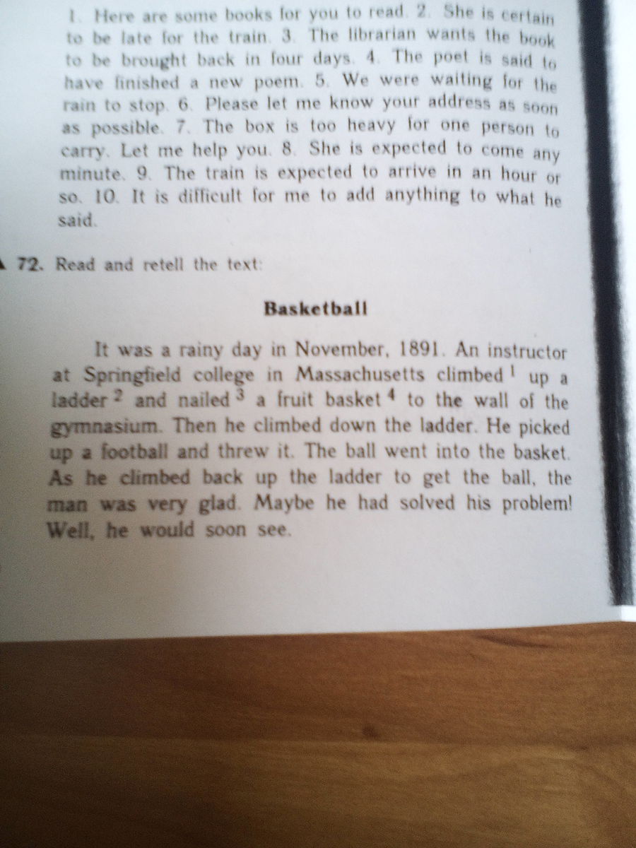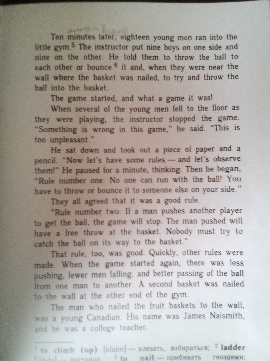 Это был дождливый день в Ноябре. ,1891. Инструктор (учитель ) в Спрингфилдской школе , штата Массачусетс взобрался по лестнице и укрепил корзину для фруктов на стену спортзала .Затем он слез с лестницы . Он взял футбольный мяч и забросил его в корзину. Мяч был в корзине .Мужчина был рад , когда снова лез за мячом в корзину по лестнице .Может быть он решил свою проблему .Ну он скоро узнает .